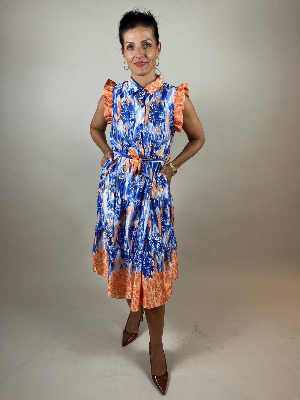 Designové šaty sladěné do modré barvy se stojáčkem