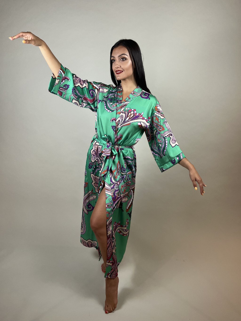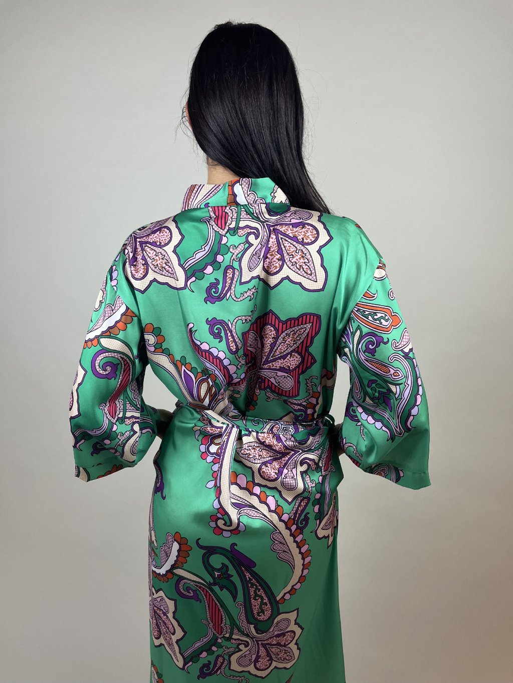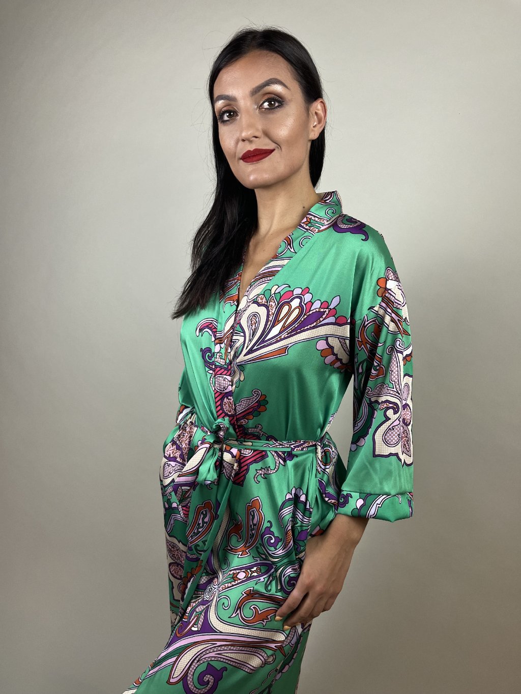 Pestrobarevné šaty s tmavě zeleným akcentem ve stylu wrap