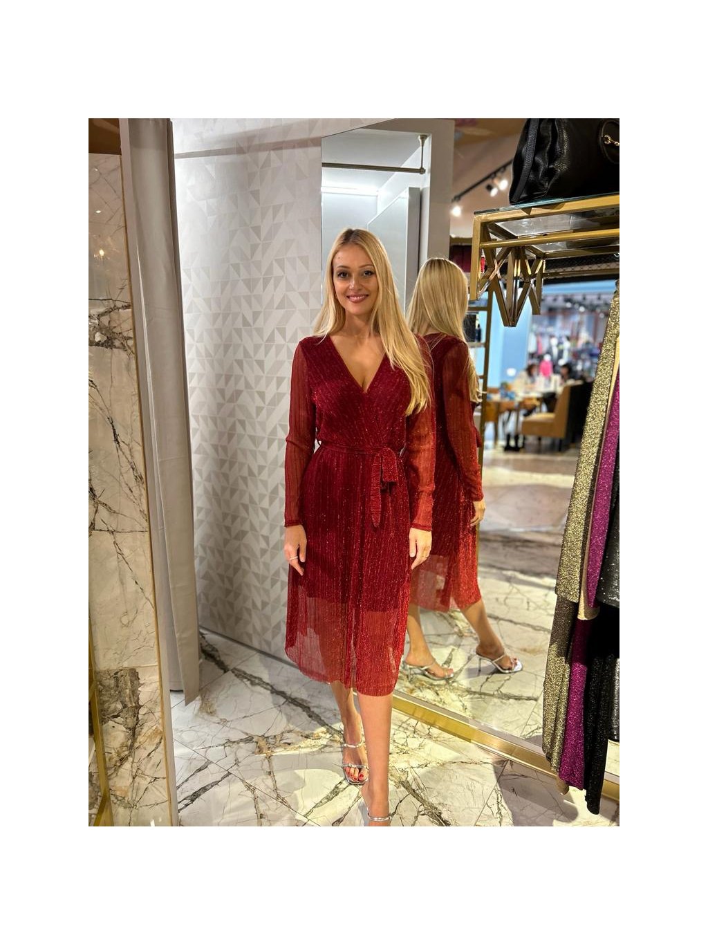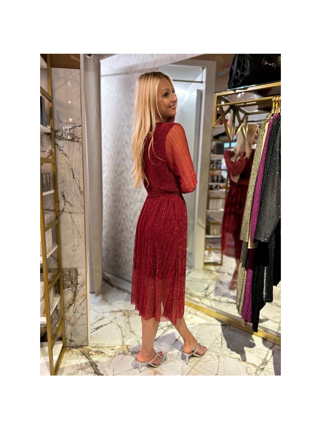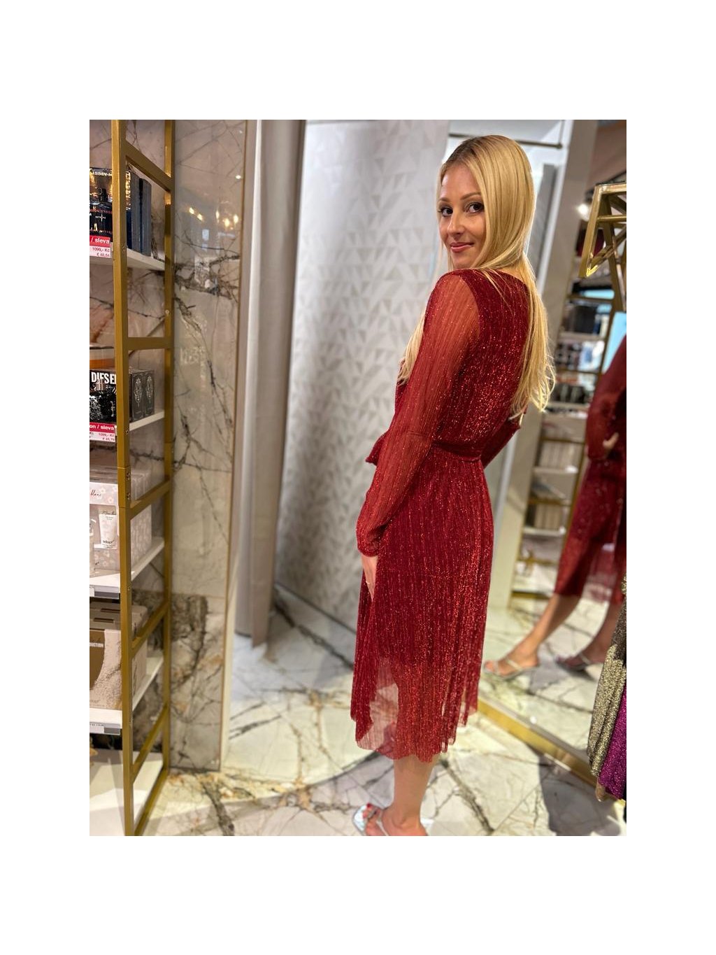 slavnostní červené šaty s průsvitnou látkou