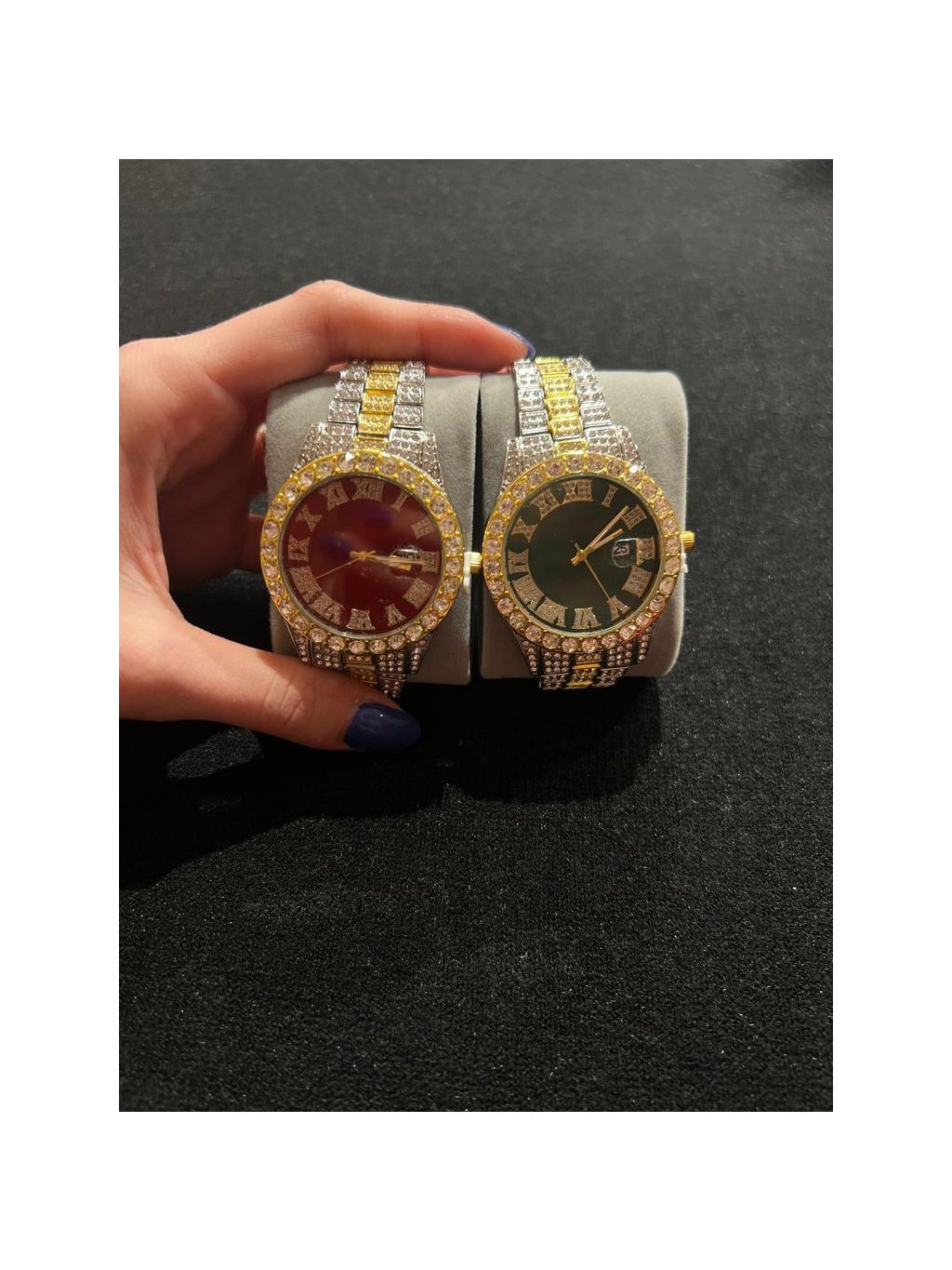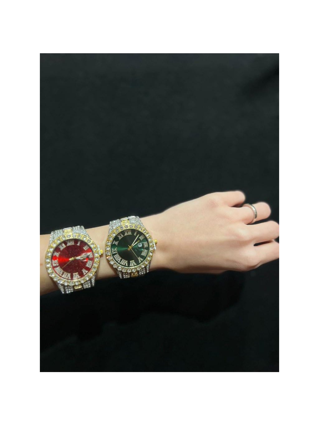 velké hodinky s červeným ciferníkem a mnoha kameny